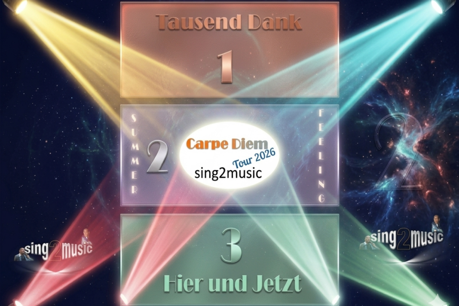 🎶 Konzert-Ankündigung: sing2music – „Carpe Diem“ Titel: Carpe Diem – Lebe den Moment! Wer: Das Musikduo sing2music mit Annalena Höhn (Gesang) und Michael Bergner (Gesang, Gitarre, Handpan). Tauchen Sie ein in einen Abend voller musikalischer Achtsamkeit und Lebensfreude! Das Duo sing2music präsentiert mitreißende Akustikversionen bekannter… Weiterlesen »Carpe Diem Tour 2026